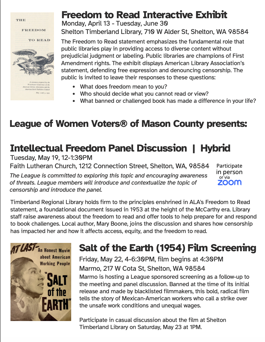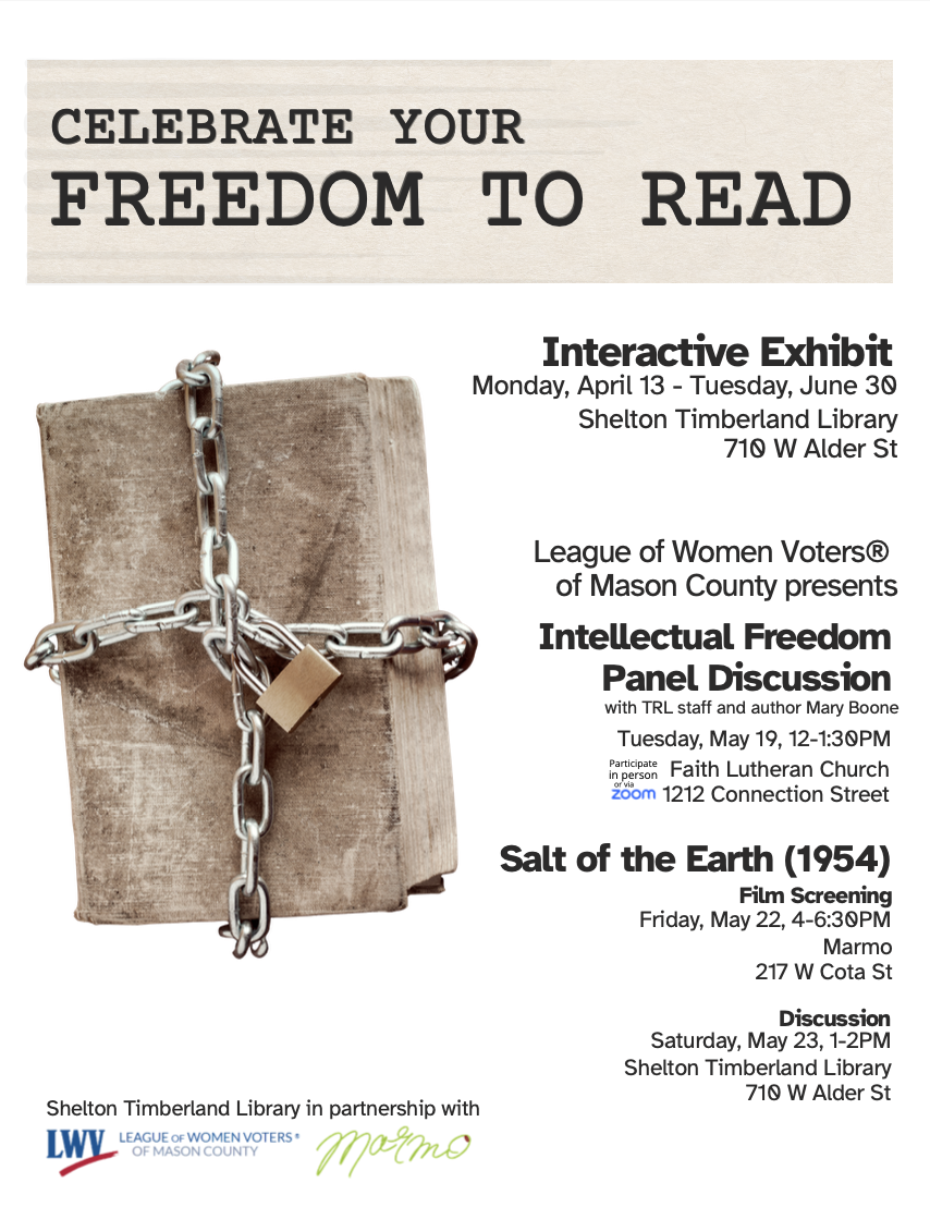 Join us on Friday, May 22, from 4-6:30 PM, where Marmo hosts the Shelton Timberland Library and League of Women Voters for a screening of Salt of the Earth (1954) as a follow-up to the Intellectual Freedom Panel Discussion.